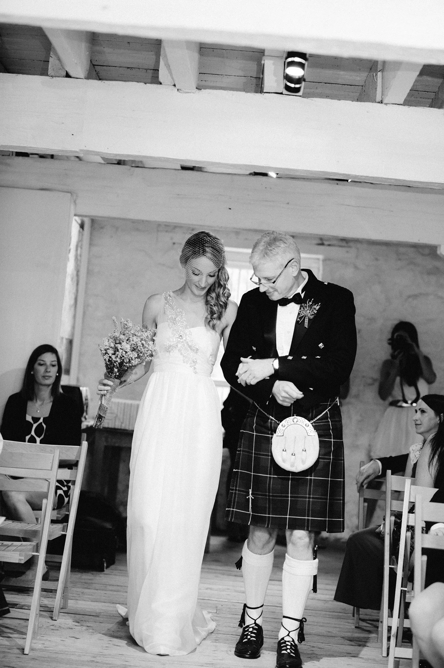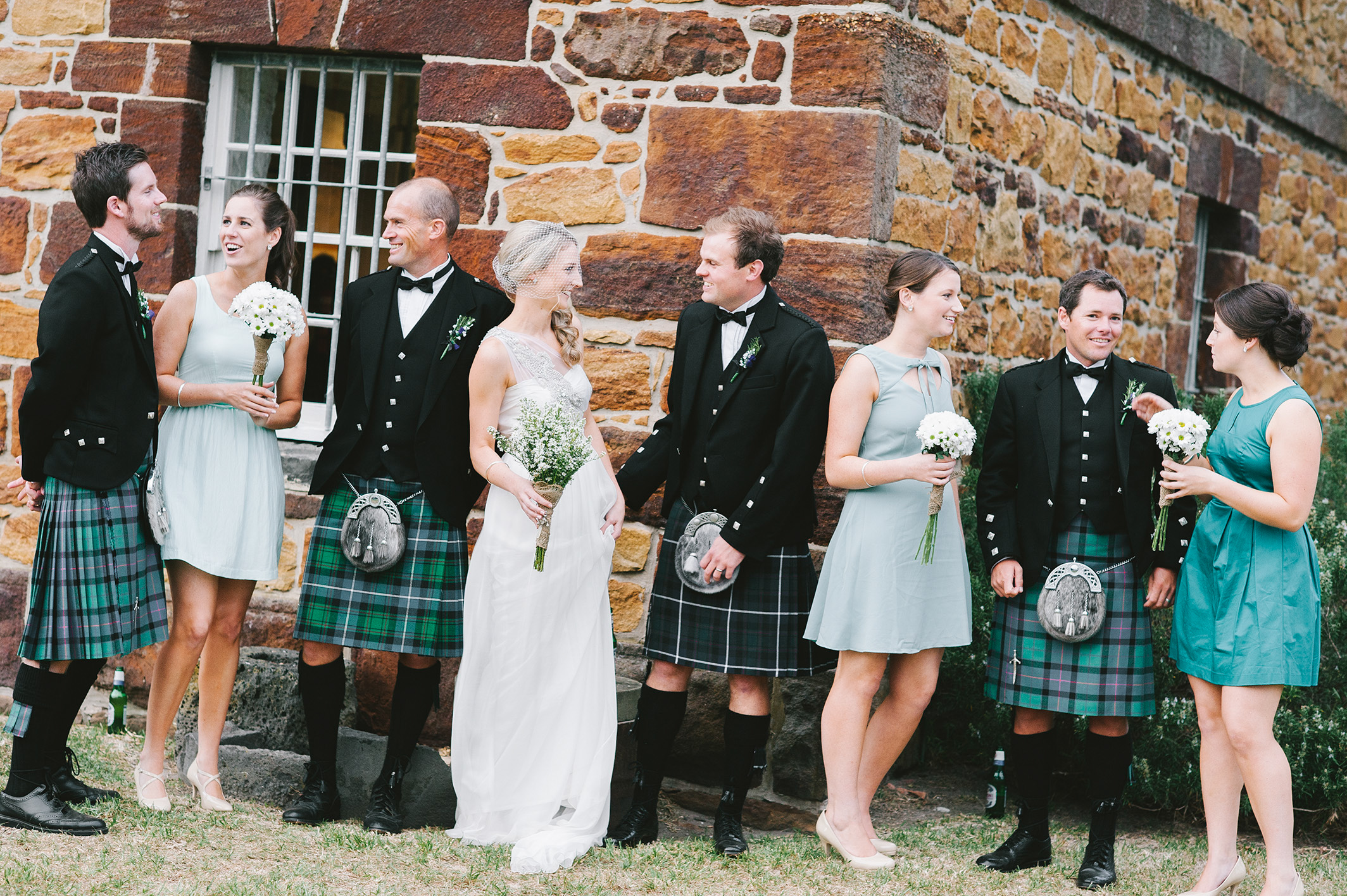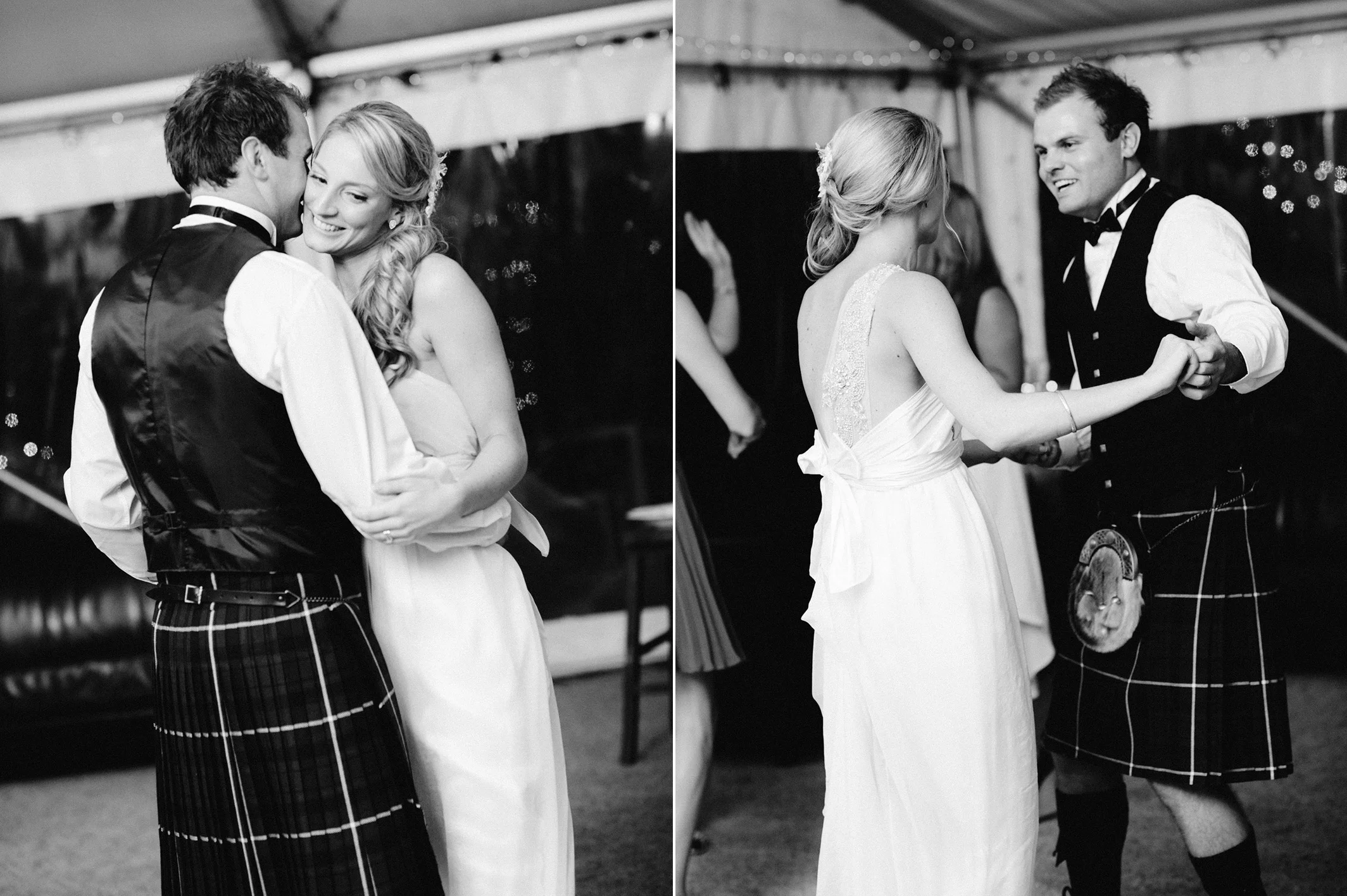 Emily is wearing a stunning Anna Campbell dress, and Justin's kilt comes directly from his University town.